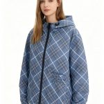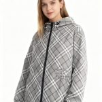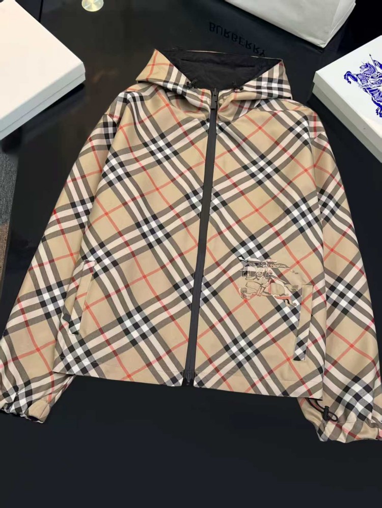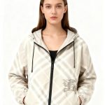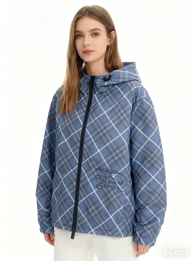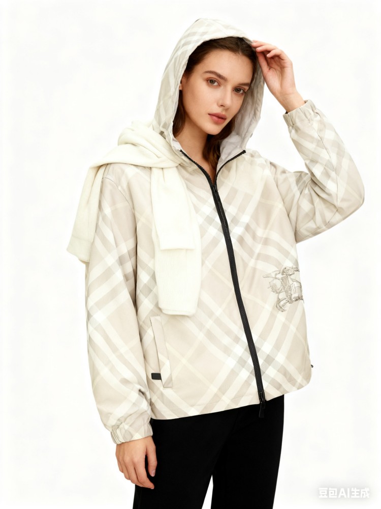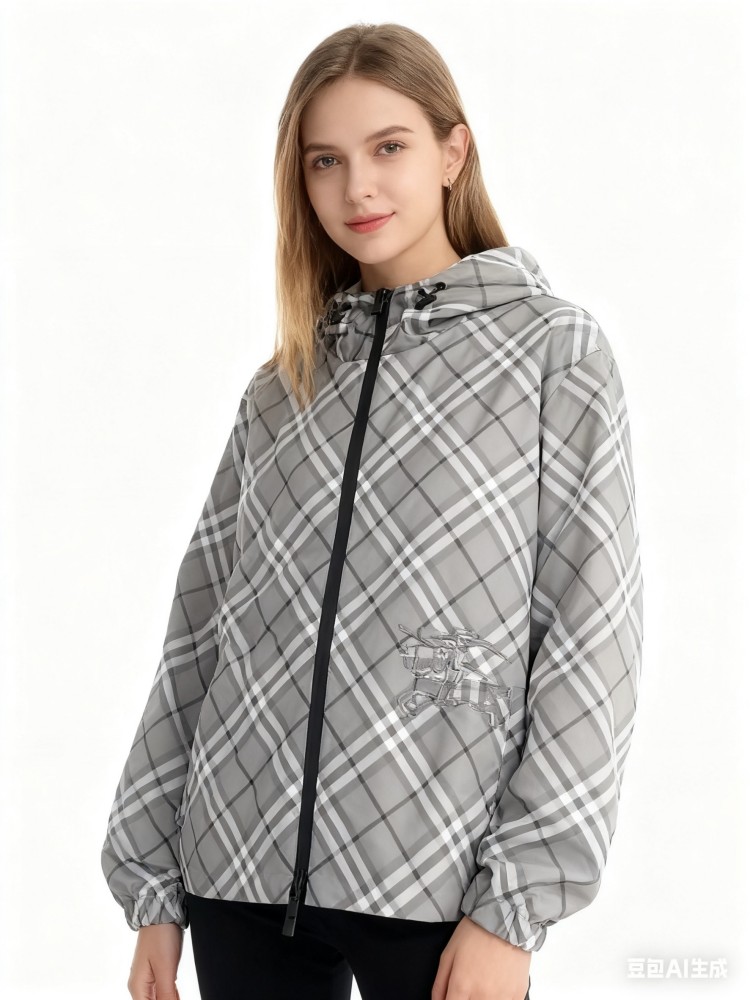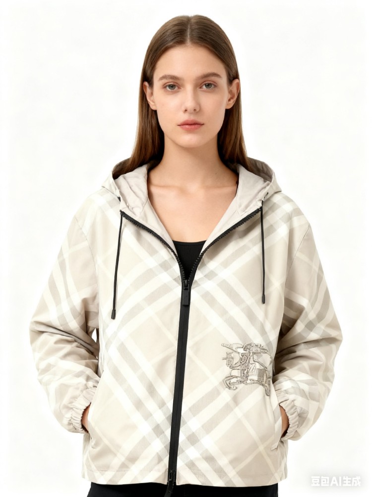2025 女装短款外套,双面可穿(格纹 + 纯色),带马术骑士刺绣徽标,连帽可调节,双向拉链 + 口袋设计,有 XS-XL 码,轻盈实用且具品牌辨识度。