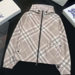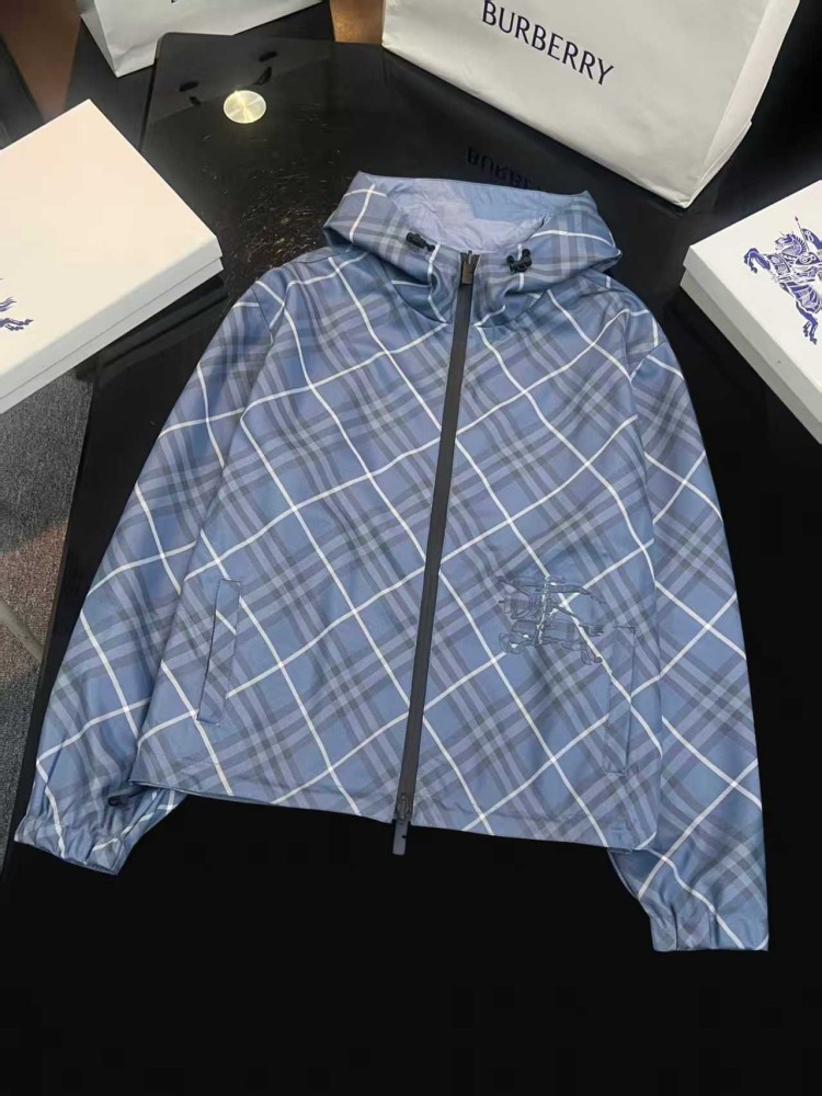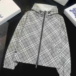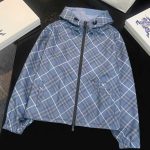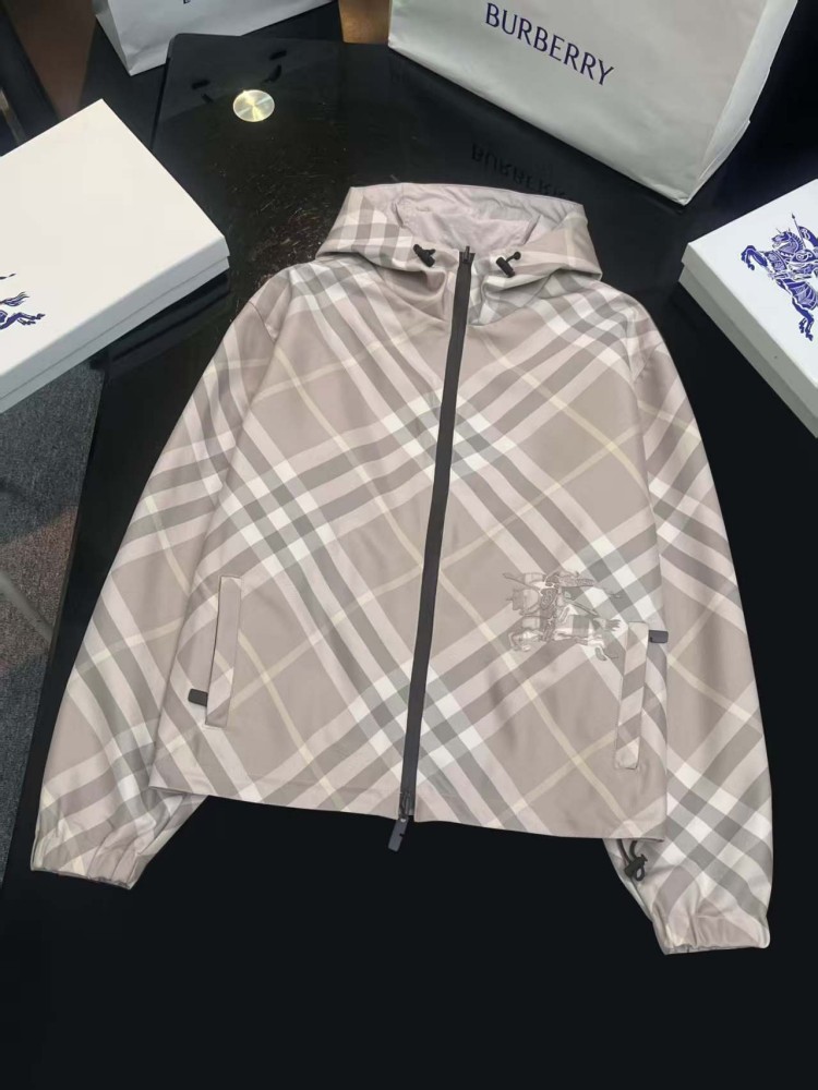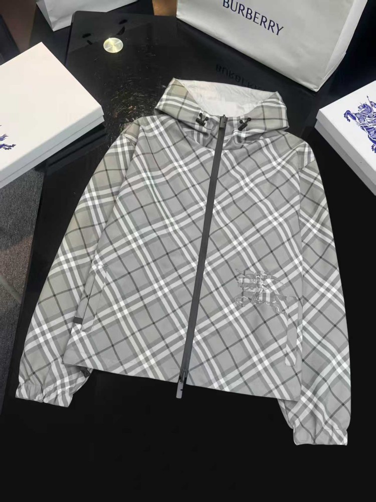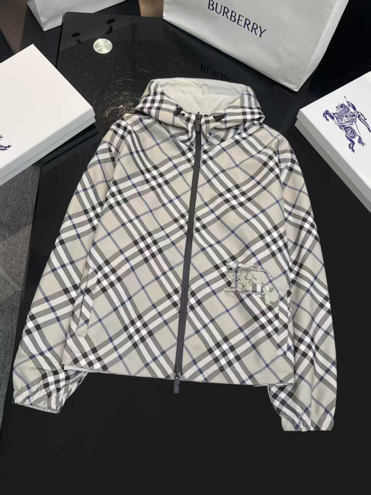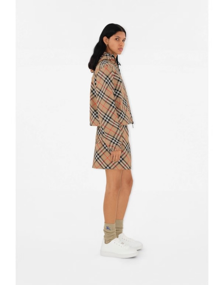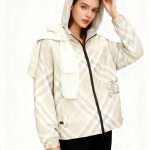 2025 女装短款外套,双面可穿(格纹 + 纯色),带马术骑士刺绣徽标,连帽可调节,双向拉链 + 口袋设计,有 XS-XL 码,轻盈实用且具品牌辨识度。